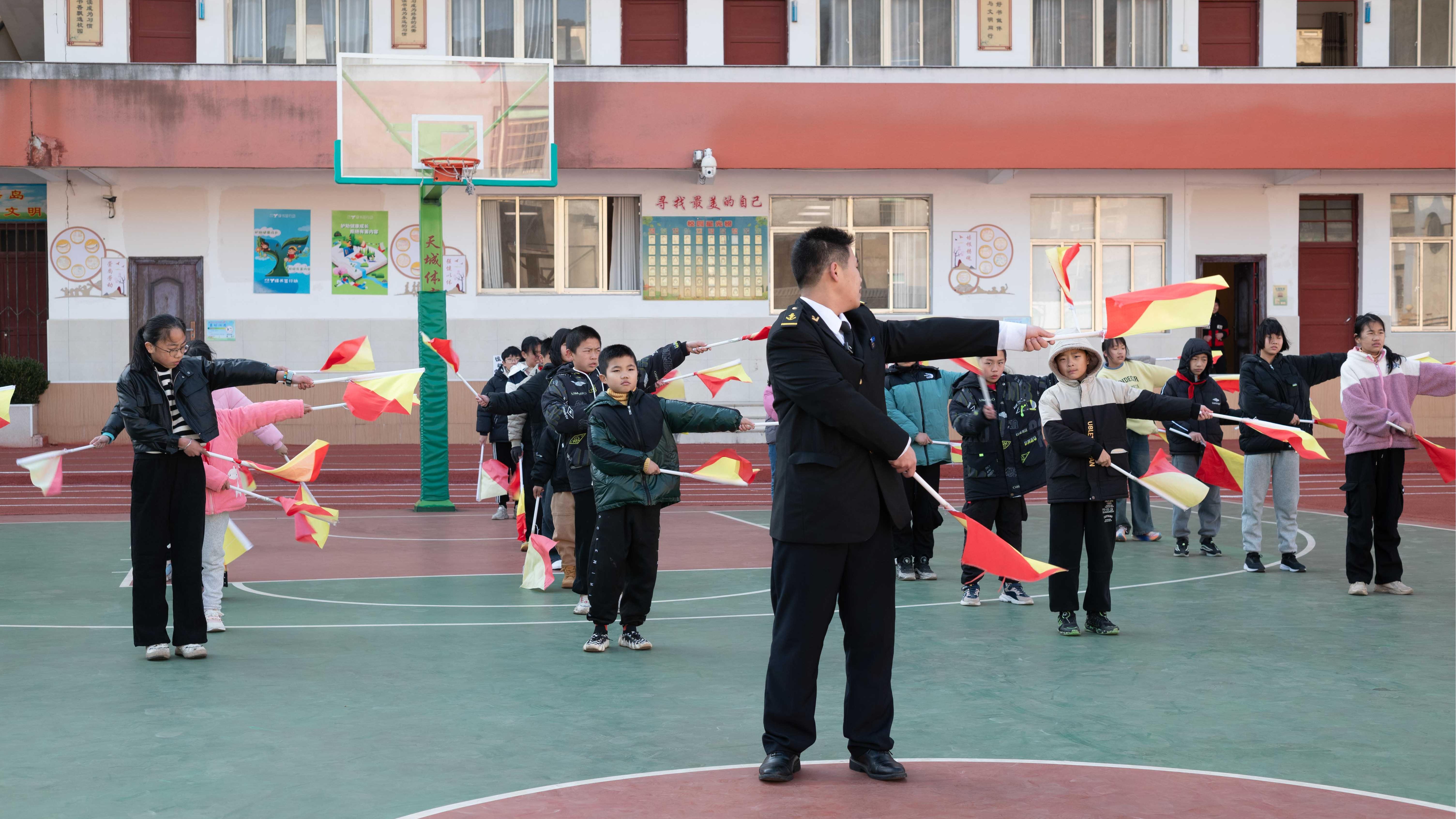 实践队成员带领海岛中心小学学生用旗语打出“我爱你中国”