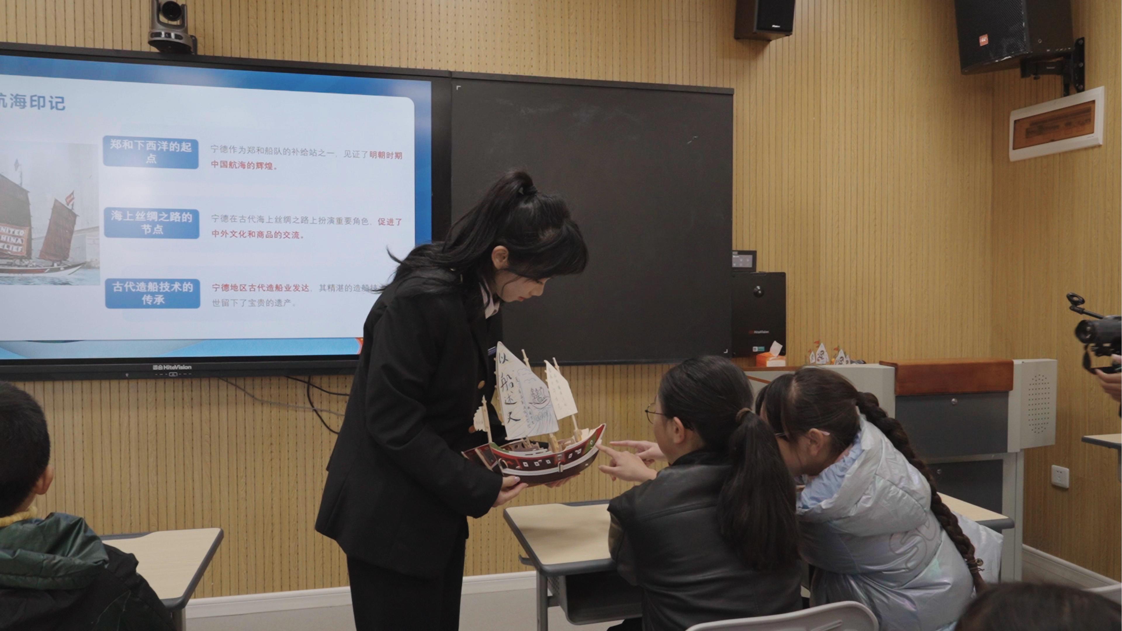 实践队成员为海岛中心小学学生讲授福船文化并带领体验船模制作