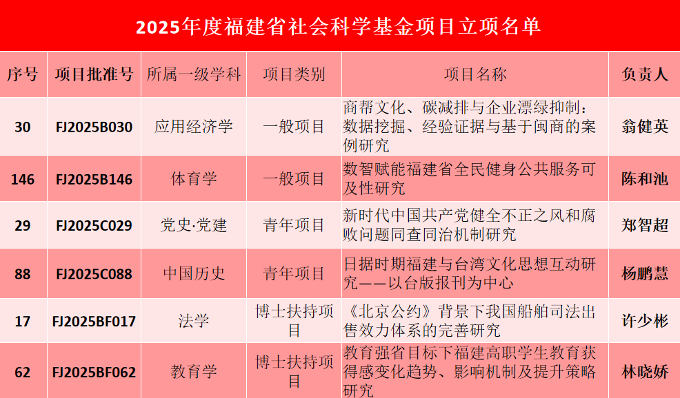 近日,福建省社会科学规划办公室公布了2025年度福建省社会科学基金项目立项名单,我校6个项目成功获批立项,立项数量创历史新高,彰显了我校在人文社科领域的科研实力。