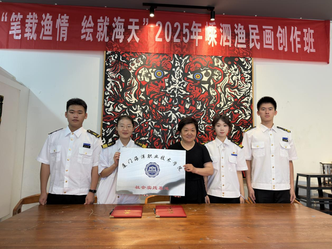 嵊泗渔歌是国家级非物质文化遗产代表性项目,实践队拜访了该项目国家传承人舒信虎,在工作室学习哼唱渔歌《东西南北风》,感受着渔民敢拼敢闯的精神。同日,实践队走访县级代表性传承人马绍洪,在工作室参观其画作《海帅》,学习渔民画绘制方法,签署社会实践基地共建协议。