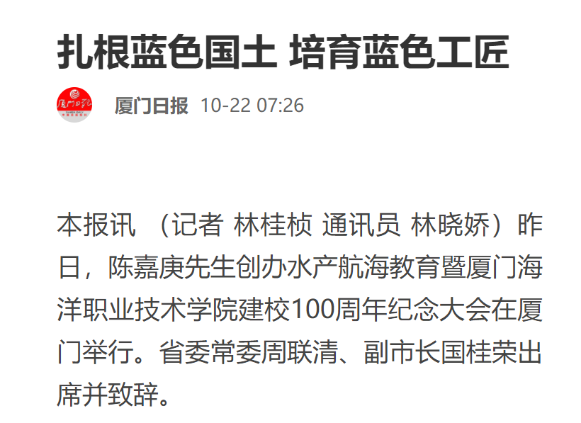 本报讯 (记者 林桂桢 通讯员林晓娇)昨日,陈嘉庚先生创办水产航海教育暨雷竞技主页建校100周年纪念大会在厦门举行。省委常委周联清、副市长国桂荣出席并致辞。