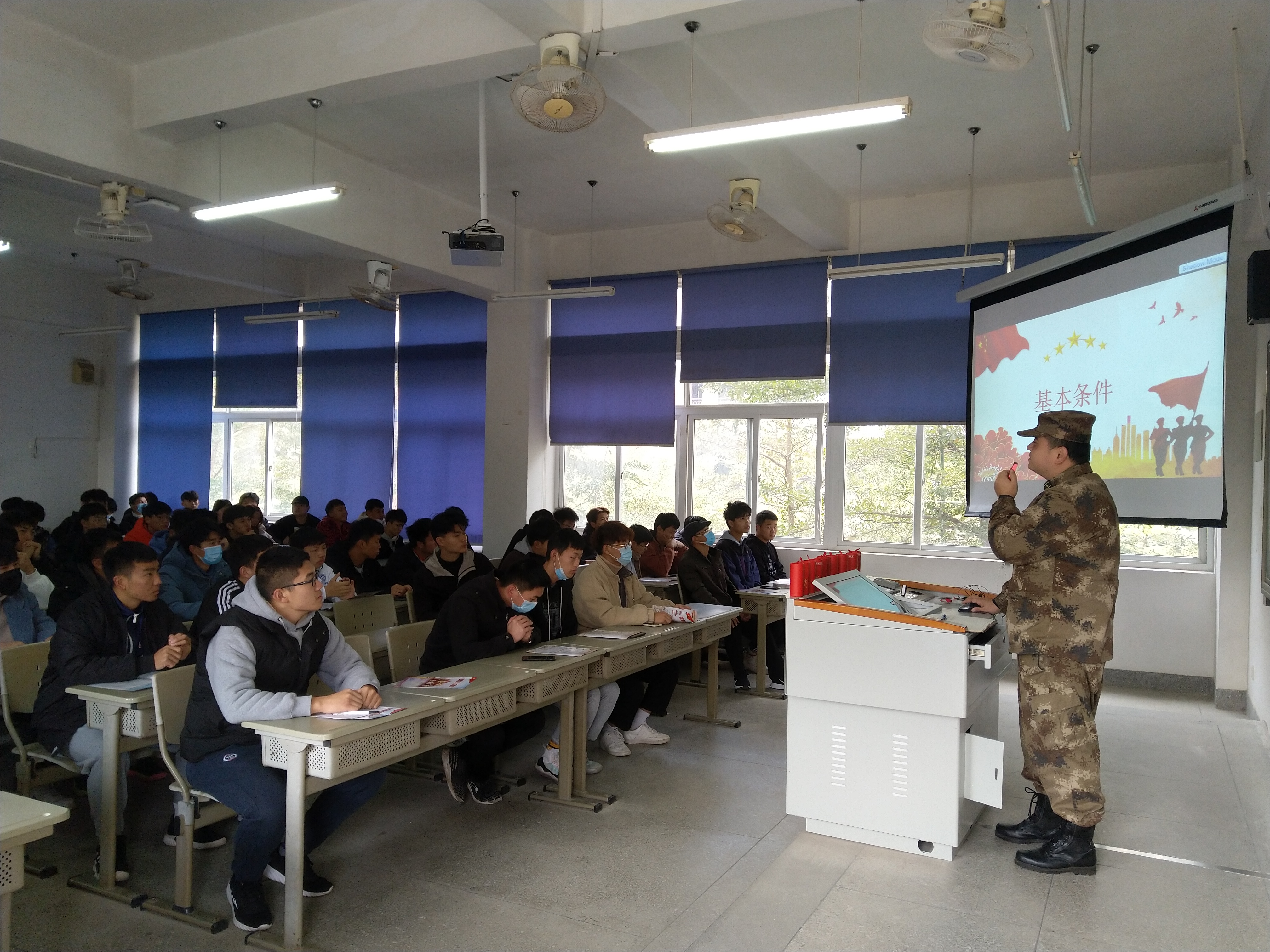 学校征兵工作领导小组成员到场参会,全体辅导员和在校学生通过网络平台观看会议直播。