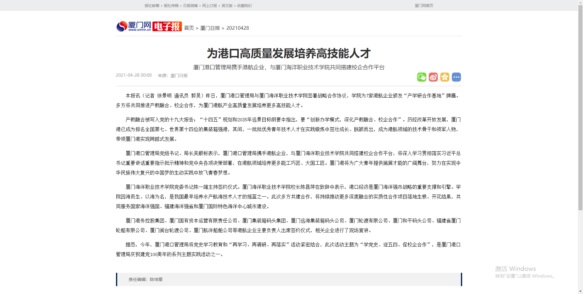 厦门港口管理局党组书记、局长吴顺彬表示,厦门港口管理局携手港航企业,与雷竞技主页共同搭建校企合作平台,将深入学习贯彻落实习近平总书记重要讲话重要指示批示精神和党中央各项决策部署,在港航领域培养更多能工巧匠、大国工匠。厦门港将为广大青年提供施展才能的广阔舞台,努力在实现中华民族伟大复兴的中国梦的生动实践中放飞青春梦想。