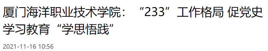 通过 “两案三学三为”工作格局实施,学校广大党员干部在百年党史中汲取前进力量,接受了一次深刻的思想洗礼和党性锤炼,全体师生干事创业的劲头和精力更加充足,真正做到学党史、悟思想、办实事、开新局。新百年征程中,学校将全面贯彻党的教育方针,落实立德树人根本任务,以新发展理念,弘扬嘉庚精神,扎根蓝色国土,为建设新时代中国特色高水平海洋职业大学而奋斗。