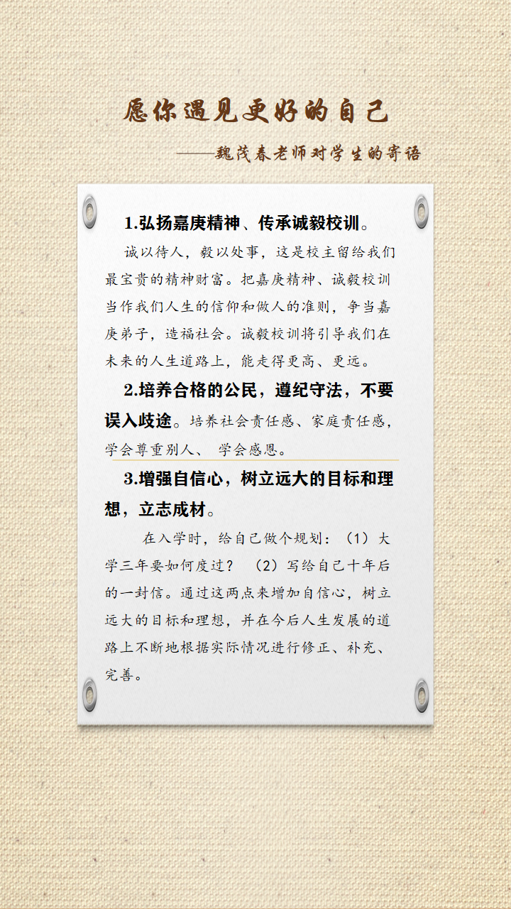 在《大学生生活与走向社会》、《社会规范与生命的支柱》这两门课程中,魏茂春老师经常把嘉庚精神、诚毅校训、树立人生目标、学习方法、待人接物、为人处事、中华民族传统美德教育等内容潜移默化地融入到课程教学中,引导学生塑造健全的人格。他常常说,贫困生的教育,需要学生的家庭、学校、社会等多方面共同参与。帮扶贫困学生,让他们得到更多的关爱,打造良好的基础,塑造健康的人格,在未来的人生中能遇见更好的自己,让海洋学院成为他们永远的精神家园。希望通过老师们的努力,能从贫困学生中培养更多优秀的嘉庚弟子,将来感恩母校,回报社会。