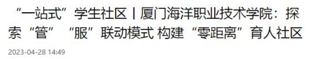 目前在翔安校区“一站式”学生社区,累计投入500多万元,形成了“一区两中心”功能体,基本能满足社区近万师生交流、生活服务、活动开展等多元化、个性化的思想学习生活需求。“一区两中心”即包括医疗、物业服务、学工管理、学生办事大厅、理论学习、生活娱乐于一体的“学生社区集中示范区”;集合学工部、团委、二级学院党政管理力量、学生活动场所在内的敦睦楼活动中心;包括辖区派出所勤务室、学校24小时值班安全岗、校园110(学生)在内的警务安全中心。“一站式”学生社区带来的管理便利深受学生赞誉,认为学生社区内有了更多自主学习、社团活动、文体活动、师生交流、便捷生活方面的设施,提升了生活幸福感。