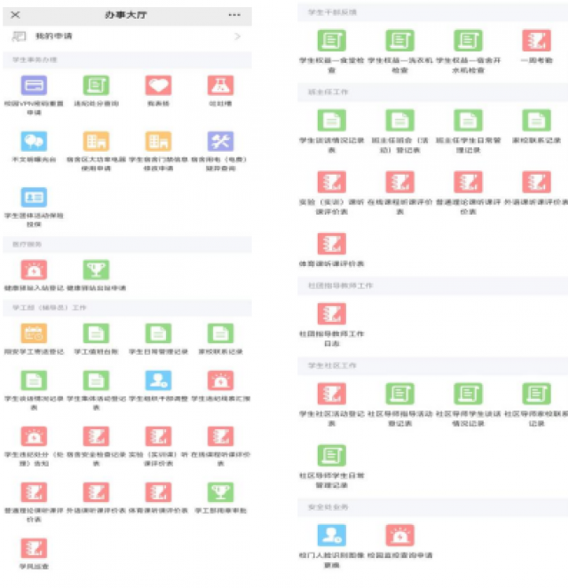另外一方面以“一站式”学生社区集中示范区为平台,通过整合易班、办公OA资源,打造面向师生的管理服务线上“智慧学工”+线下学生服务大厅模式,精准对接学生需求,致力于利用数字化、信息化功能为师生提供信息查询、线上办理、投诉建议等服务,同时结合线下服务大厅建成数据集成、网络服务、事务办理于一体的高效率工作平台。目前线上信息化服务平台已实现面向学生、专职学工管理人员、班主任、社团指导老师、社区导师、第三方服务人员在内的六大类不同身份的70多项业务流程。线下服务大厅已经入驻资助、征兵、教务、团学、学生证表卡簿、移动电信等综合服务内容。