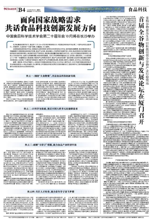 中粮营养健康研究院党委委员、副院长郭斐在致辞中表示,近年来,中粮集团高度关注全谷物领域,充分发挥自身在消费者研究、谷物加工技术、营养功能评价、质量安全控制等多学科领域的研发优势,围绕谷物食品开发、关键工艺提升、配料综合开发等方面集中攻关。在标准建设方面,中粮营养健康研究院参与制定《全麦粉》行业标准。