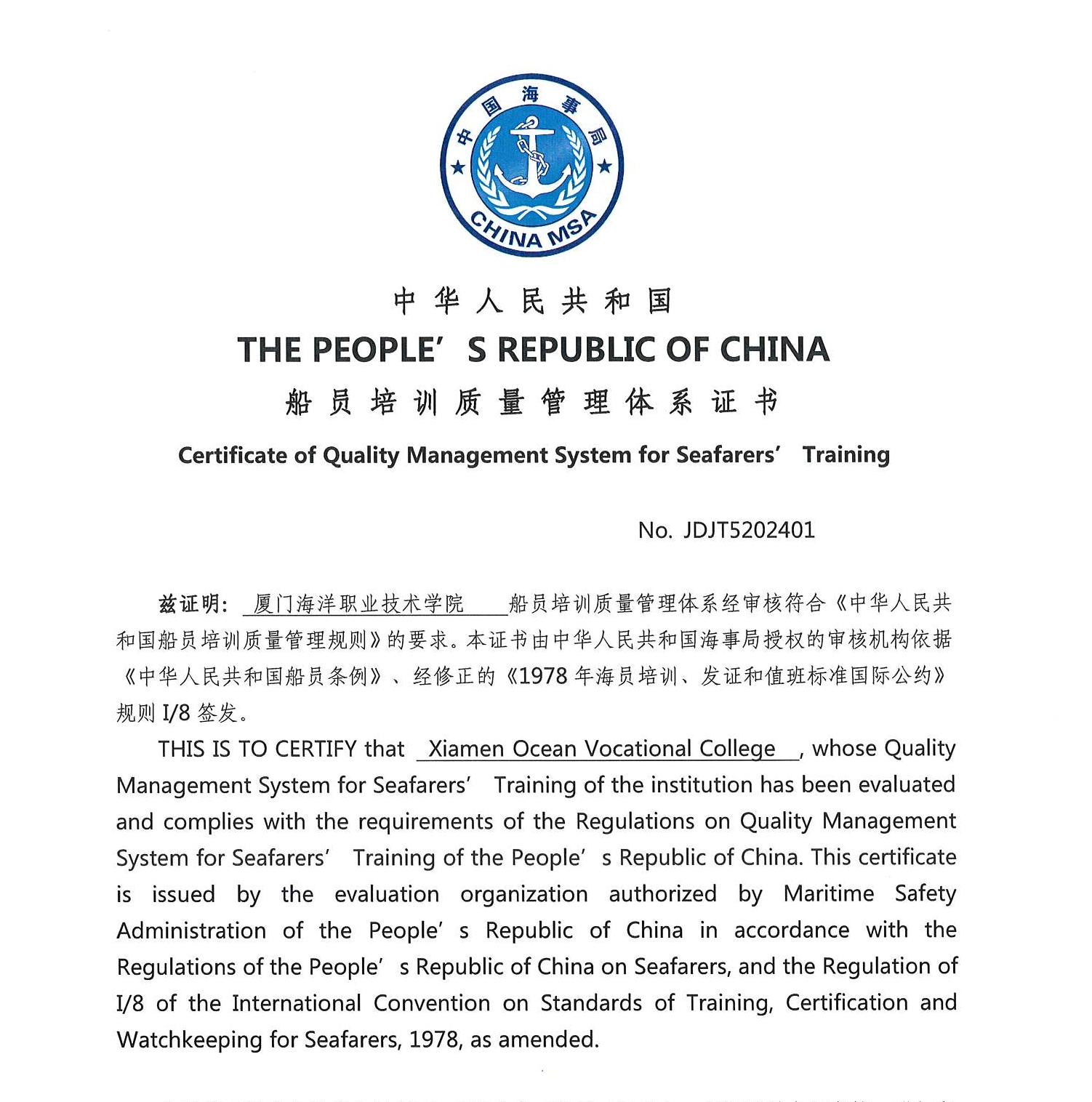 近期,我校顺利通过船员培训质量管理体系换证审核,取得福建海事局颁发的船员培训质量管理体系证书。