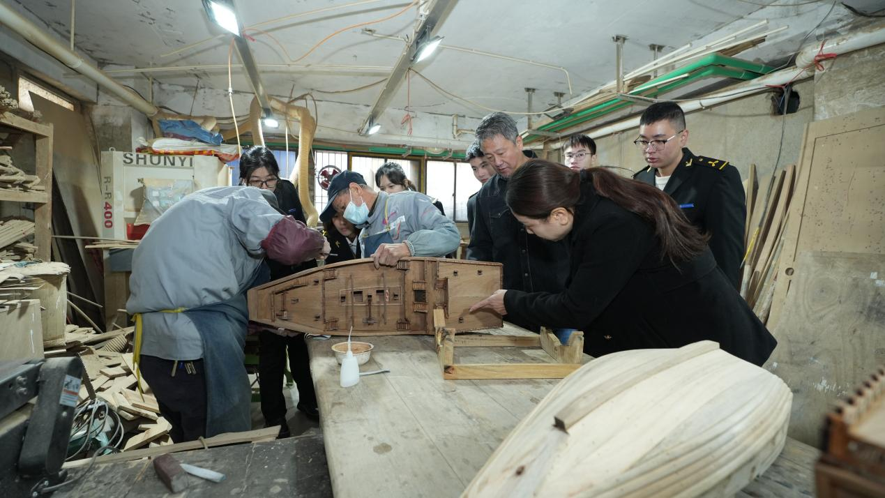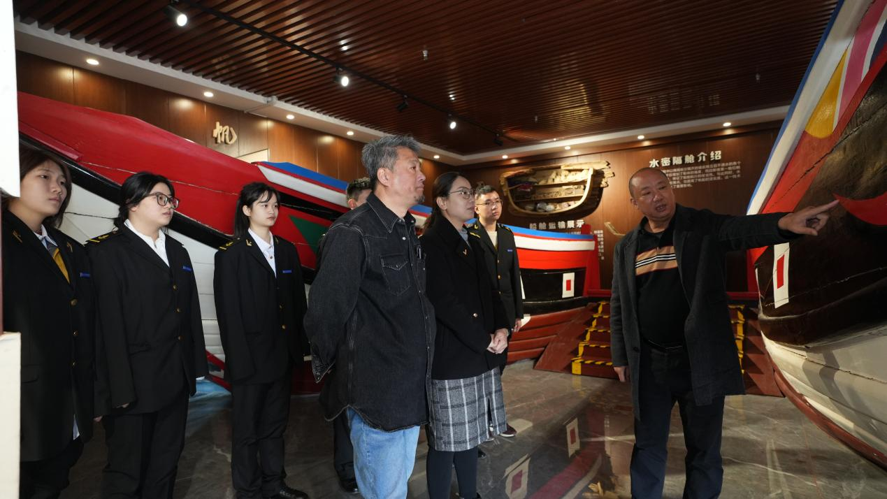实践队来到学院社会实践基地福船文化展示中心,就“如何保护与传承非遗技艺”这一问题,与水密隔舱福船研究协会成员进一步深入探讨,并展示带去的传承方案、文创周边、模型等。实践队还特邀中国工艺美术大师冯宇平,一同前往海丝文化福船馆、福船古船模制造有限公司进行调研交流。在泉港区代表性传承人林配宗的介绍下,实践队了解到,福船文化正以研学、文旅、展销、产业发展等方式焕发新的生机。现场,双方共建社会实践基地,未来将持续加深合作交流、人才培养,共同培育新时代非遗传承人。