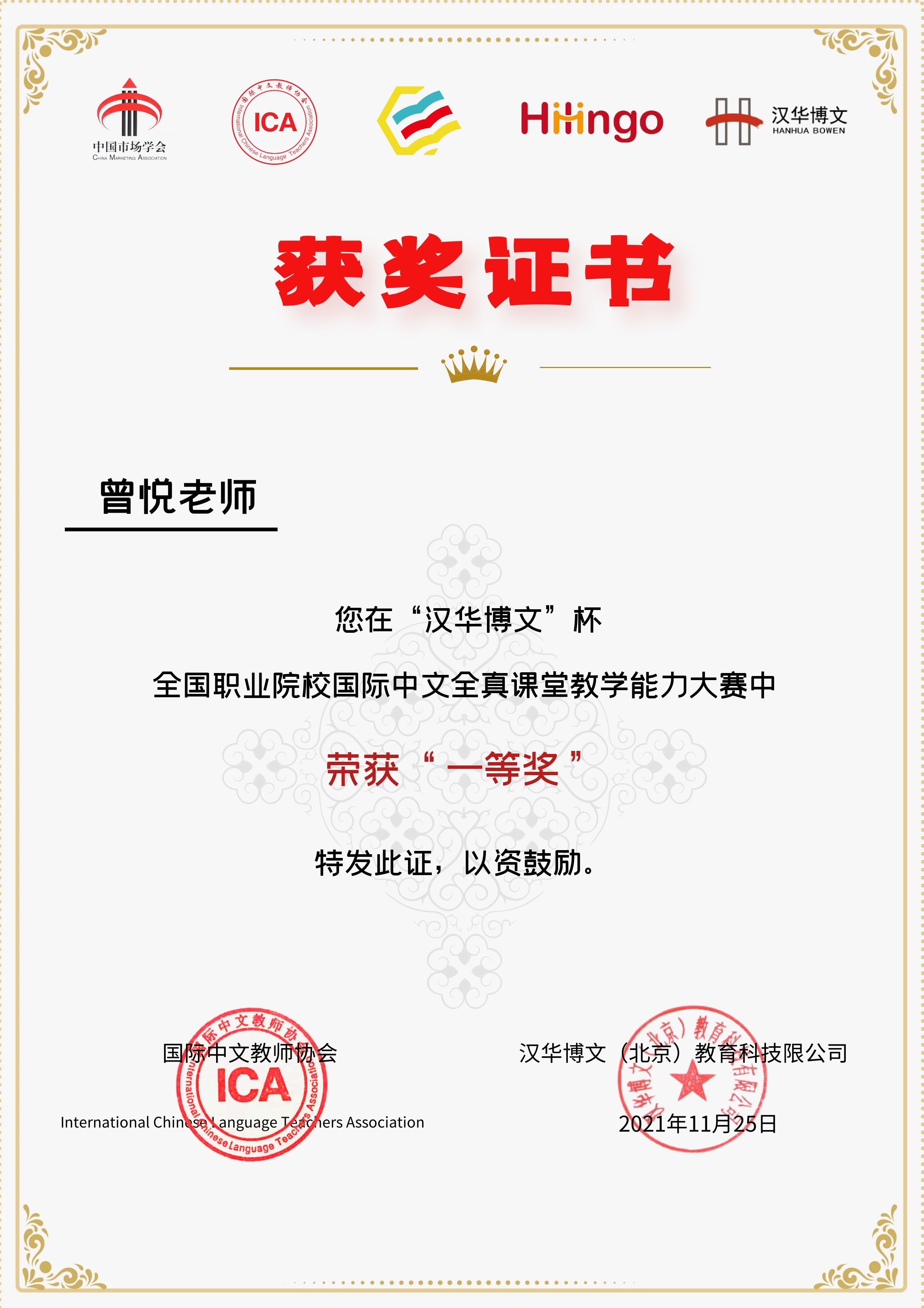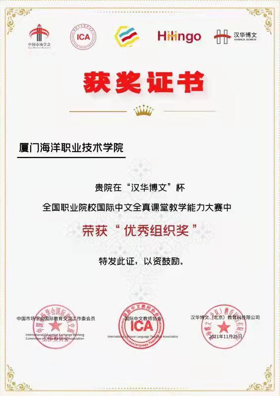 近日,我校组织教师参加首届“汉华博文”杯全国职业院校国际中文全真课堂教学能力大赛,我校获得优秀组织奖,对外合作交流中心曾悦老师荣获一等奖。