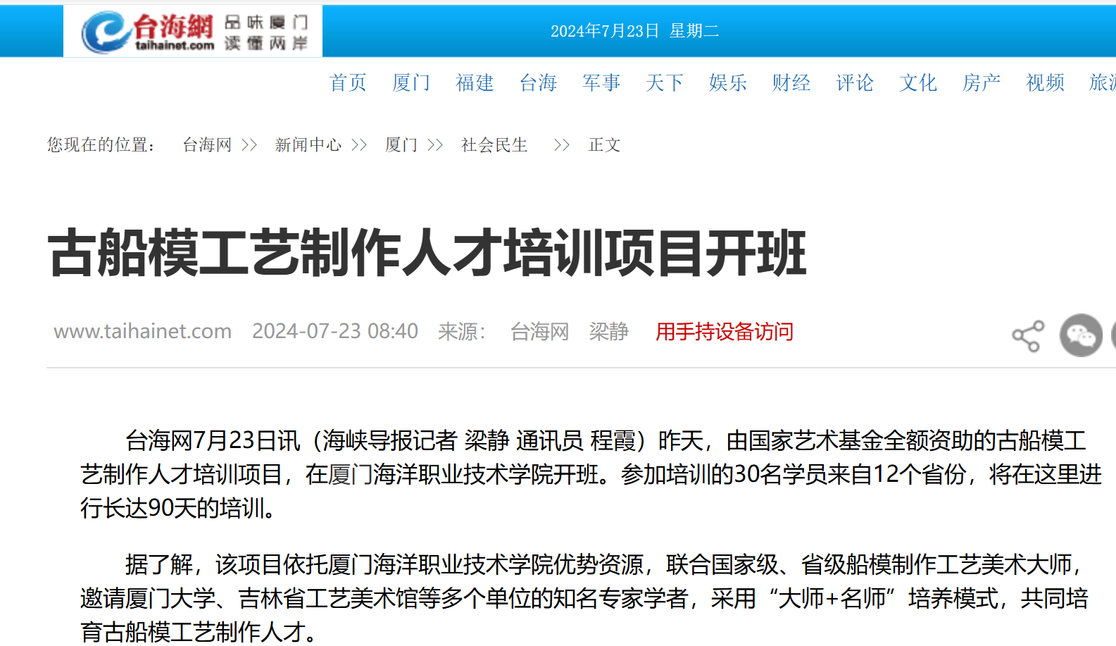 台海网7月23日讯(海峡导报记者梁静通讯员程霞)昨天,由国家艺术基金全额资助的古船模工艺制作人才培训项目,在厦门海洋职业技术学院开班。参加培训的30名学员来自12个省份,将在这里进行长达90天的培训。