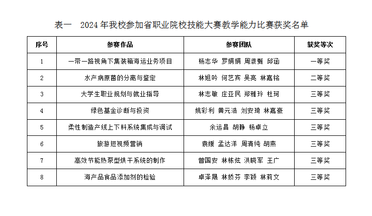 在2024年福建省职业院校技能大赛教学能力比赛中,我校共12支教学团队参加比赛,获得一等奖1项、二等奖1项、三等奖6项。