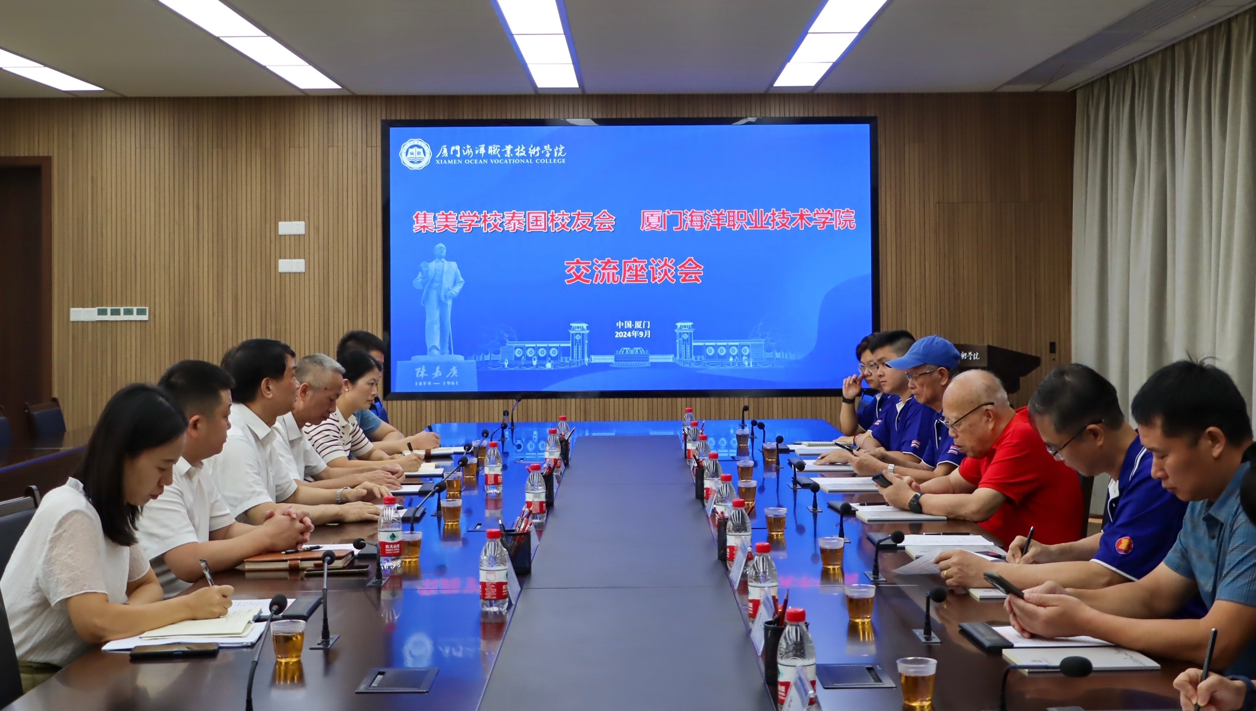 陈一端对陈坤山一行来校访问表示热烈欢迎,并简要介绍了学校办学历史、发展成果以及学校纪念校主陈嘉庚先生诞辰150周年活动筹备情况等,对集美学校泰国校友会一直以来对学校的关心和支持表示感谢。他指出近年来双方以华人留学生培养为基础,在交流互动中结下深厚友谊,陈坤山、潘丞仲曾多次带队来校看望泰国留学生、交流工作。他表示希望双方在留学生招生、职业教育“出海”等方面深化合作,进一步弘扬嘉庚精神,为推动嘉庚先生教育事业高质量发展贡献力量。