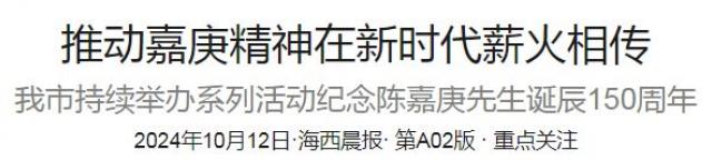 晨报讯(厦门日报记者 卫琳)今年是著名爱国华侨领袖、企业家、教育家、慈善家、社会活动家陈嘉庚先生诞辰150周年,我市持续举办系列纪念活动,深切缅怀陈嘉庚先生的历史功绩和人格风范,为强国建设、民族复兴凝聚人心与力量。