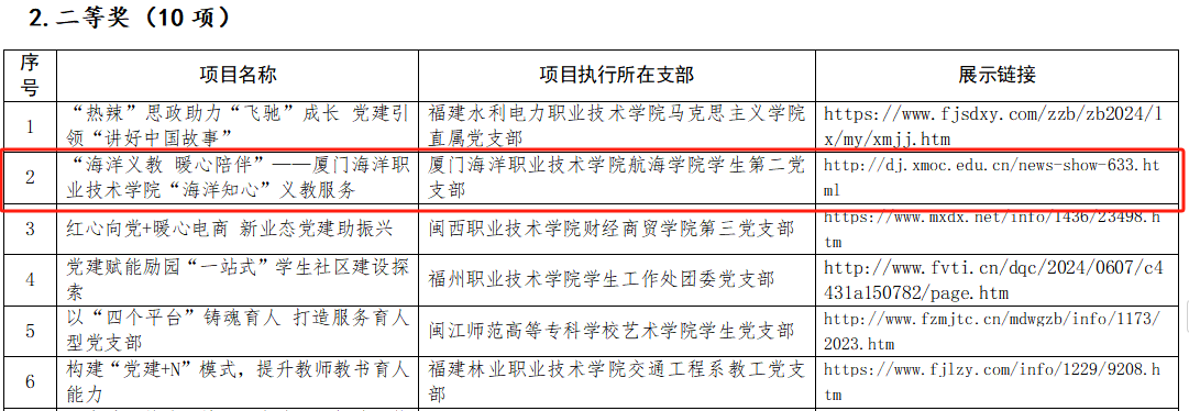 近日,中共福建省委教育工作委员会公布了关于高校党支部工作“立项活动”优秀成果和“党员好故事、书记好党课、支部好案例”评选结果,航海学院学生第二党支部的《“海洋义教 暖心陪伴”——雷竞技主页“海洋知心”义教服务》项目荣获高职高专院校党支部工作“立项活动”优秀成果二等奖。