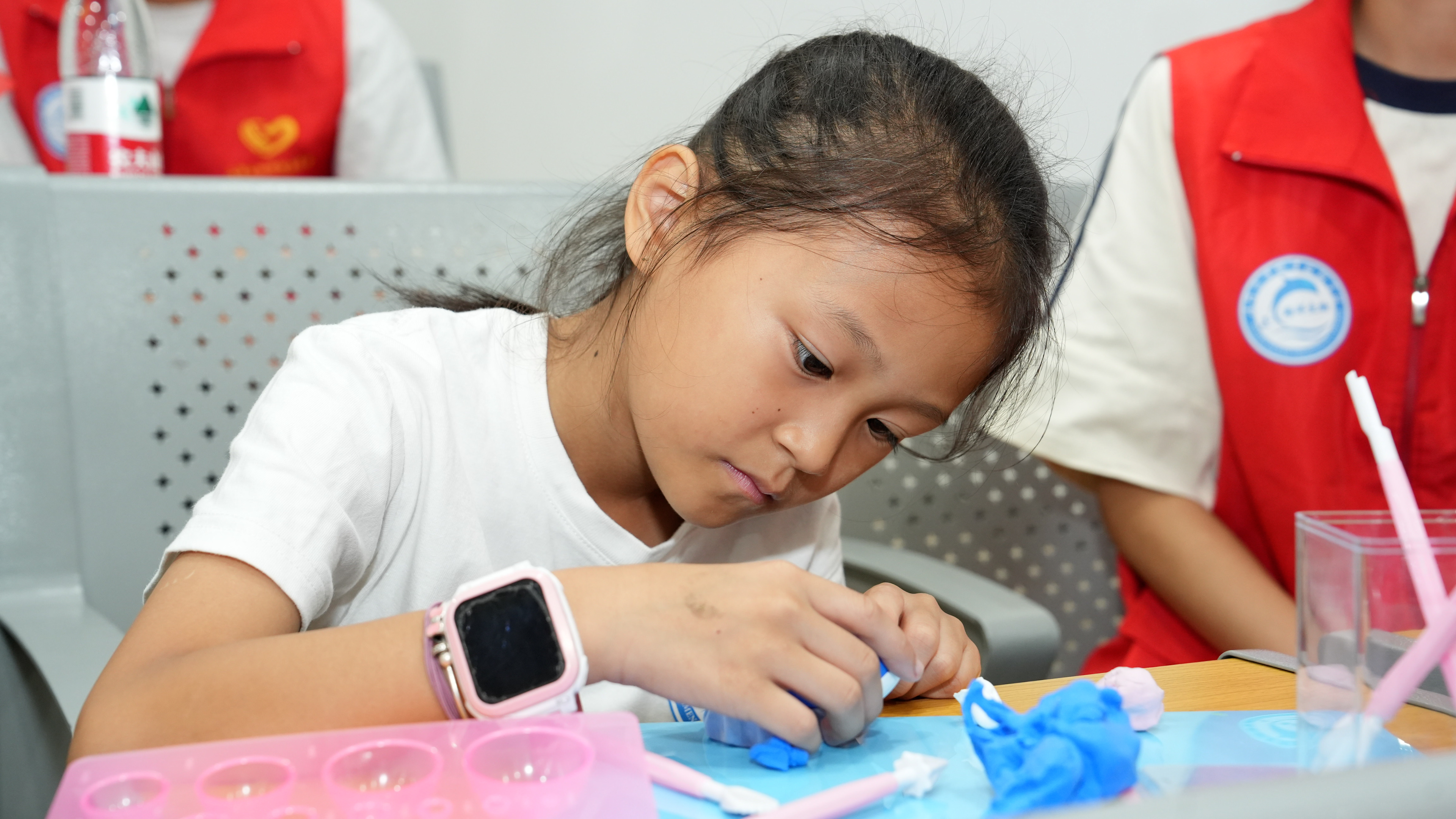 海洋生物学院加工3221班的黄益辰同学给现场的研学团队带来非遗文化体验—手工“面塑”。他拥有6年的食品雕刻经验,在校创立“奉心巧契”工作室,曾获多项省级创新创业竞赛奖项。“奉心巧契”工作室结合海洋生物专业特色,给在场的研学成员面对面、手把手地传授“小海豚”制作方法。一只只栩栩如生的海豚作品活灵活现,深受孩子们的喜爱。