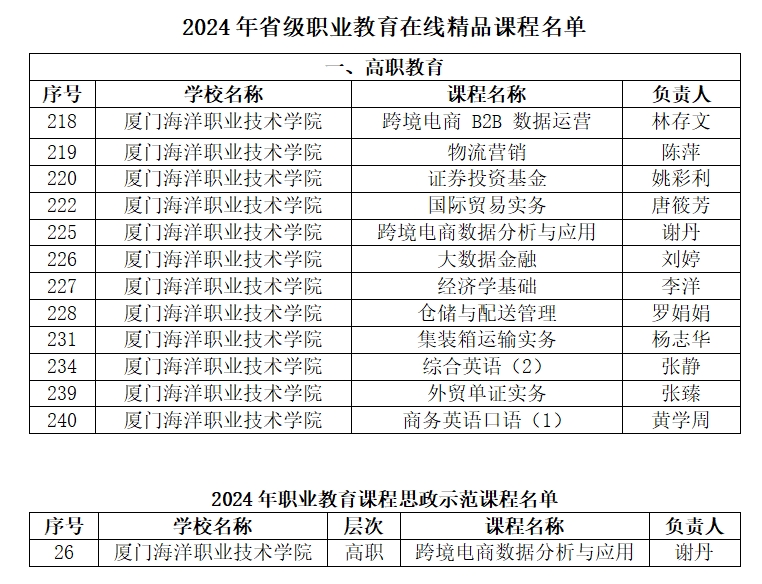 近日,福建省教育厅公布了2024年省级职业教育与终身教育重点项目名单,国际商贸学院《跨境电商B2B数据运营》等12门课程获省级在线精品课程立项,《跨境电商数据分析与应用》课程获省级课程思政示范课程建设立项。